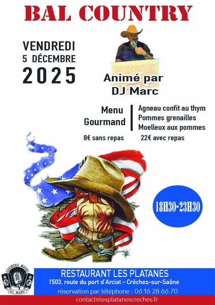 Date : 05/12/2025 (Événement passé) Horaires : 18h30-23h30 Tarifs : 8€ sans repas, 22€ avec repas Organisateur : RESTAURANT LES PLATANES Adresse de l'événement : RESTAURANT LES PLATANES 1503 ROUTE DU PORT D'ARCIAT 71680 CRECHES SUR SAONE Informations complémentaires : Animation : DJ Marc. Menu gourmand : agneau confit au thym, pommes grenailles, moelleux aux pommes. Danses pratiquées : Country Référence de l'annonce : 56341 call06 16 28 66 70