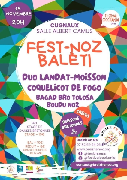 Date : Samedi 15/11/2025 Horaires : 20h Tarifs : Bal 10€ / 8€ (étudiants, sans emploi, adhérents Breizh en Oc, participants au stage) / gra Organisateur : ASSOCIATION BREIZH EN OC Adresse de l'événement : SALLE ALBERT CAMUS 1 PLACE DE LA RÉPUBLIQUE 31270 CUGNAUX Informations complémentaires : Animation : Duo Landat-Moisson, Coquelicot de Fogo, Bagad Bro Tolosa, Boudu Noz. Stage d'initiation aux danses bretonnes de 14h à 17h (10€). Crêpes et boissons bretonnes. Festival Occitania 2025. Tarif réduit au bal pour les participants au stage. Galettes salées 4,50€ (réservation conseillée). Danses pratiquées : Danse folklorique Référence de l'annonce : 54282 call07 82 69 24 26