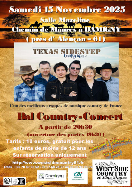 Date : Samedi 15/11/2025 Horaires : 20h30 Tarifs : 18€ Gratuit pour les enfants de moins de 12 ans Organisateur : WEST SIDE COUNTRY ET LINE DANCE Adresse de l'événement : SALLE MAZELINE CHEMIN DE MAURÈS 61250 DAMIGNY Informations complémentaires : Animation : Texas Sidestep, l'un des meilleurs groupes de musique country de France. Ouverture des portes 19h30. Sur réservation uniquement. Boissons et pâtisseries sur place. Danses pratiquées : Country Référence de l'annonce : 53979 call06 78 89 56 52call06 07 68 24 27