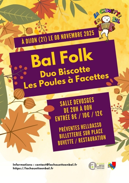 Date : Samedi 08/11/2025 Horaires : 17h à 23h55 Tarifs : Bal : 8, 10 et 12€. Stage : 12€. Stage + bal : 20€. Organisateur : LA CHOUETTE EN BAL Adresse de l'événement : SALLE DEVOSGE 5 BIS RUE DEVOSGE 21000 DIJON Informations complémentaires : 17h à 19h : Stage "Variations en danse de couple" animé par La Chouette en Bal et Duo Biscotte