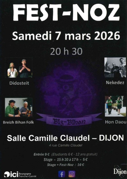 Date : Samedi 07/03/2026 Horaires : 20h30 Tarifs : 9€ (étudiants 6€, moins de 12 ans gratuit) Organisateur : ASSOCIATION BIZ-BIHAN Adresse de l'événement : SALLE CAMILLE CLAUDEL 4 RUE CAMILLE CLAUDEL 21000 DIJON Informations complémentaires : Animation : Didosteït, Nekedez, Breizh Bihan Folk, Hon Daou. Stage d'initiation de 15h30 à 17h (5€). Formule stage + fest-noz : 10€. Buvette et crêpes. Soirée ouverte à tous. Accès adapté aux personnes à mobilité réduite. Danses pratiquées : Danse folklorique Référence de l'annonce : 63875