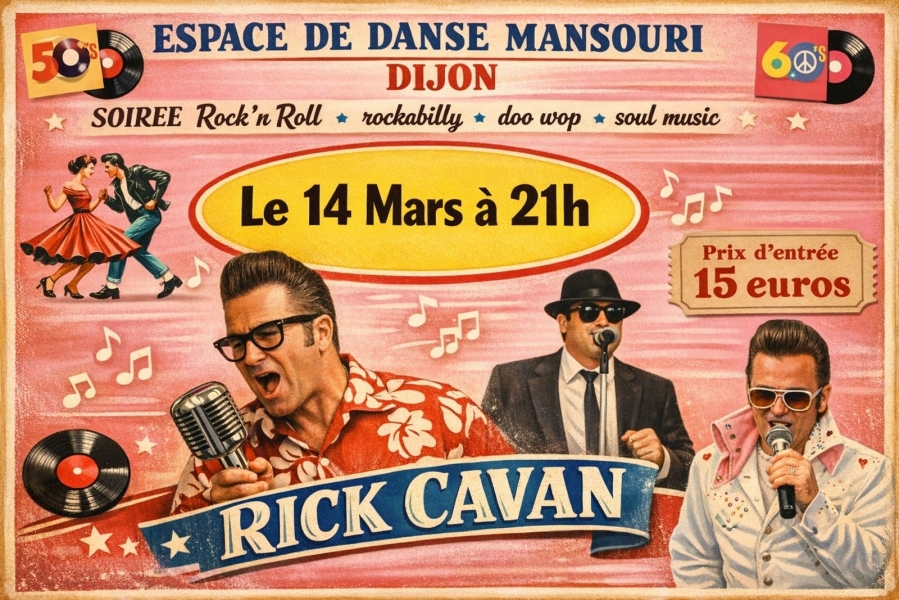 Date : Samedi 14/03/2026 Horaires : 21h Tarifs : 15€ Organisateur : ESPACE DE DANSE MANSOURI Adresse de l'événement : ESPACE MANSOURI 15 RUE EDMOND-VOISENET 21000 DIJON Informations complémentaires : Animation : Rick Cavan et DJ Bouss. Soirée rock'n roll, rockabilly, rhythm and blues, doo wop, soul music. Salle climatisée avec parquet spécial danse et sono professionnelle. Boissons softs, gâteaux, gourmandises et café à volonté. Vestiaire gratuit et parking. Ouvert à tous. Danses pratiquées : Bachata, Madison, Rock Référence de l'annonce : 63954 call06 62 85 92 33