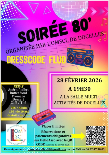 Date : Samedi 28/02/2026 Horaires : 19h30 Tarifs : 28€/adulte, 15€/moins de 10 ans, gratuit pour les moins de 3 ans Organisateur : OMSCL DE DOCELLES Adresse de l'événement : SALLE MULTIACTIVITÉS 20 RUE DU COLONEL-BERTIN 88460 DOCELLES Informations complémentaires : Repas avec apéritif offert, buffet froid, fromage, dessert, café ou thé. Dress code fluo. Places limitées. Accès adapté aux personnes à mobilité réduite. Réservation et paiement obligatoires jusqu'au 28 janvier 2026. Danses pratiquées : Disco Référence de l'annonce : 62744 call06 22 47 30 03