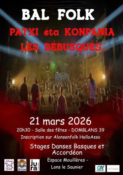 Date : Samedi 21/03/2026 Horaires : 20h30 Tarifs : 12€/14€ Organisateur : ALONSENFOLK Adresse de l'événement : SALLE DES FÊTES CHEMIN DE LA SALLE DES FÊTES 39210 DOMBLANS Informations complémentaires : Animation : Patxi eta Konpania et Les Débusqués. Réservation vivement conseillée sur HelloAsso. Stages Danses Basques et Accordéon à l'Espace Mouillères à Lons-le-Saunier. Danses pratiquées : Danse folklorique Référence de l'annonce : 64546