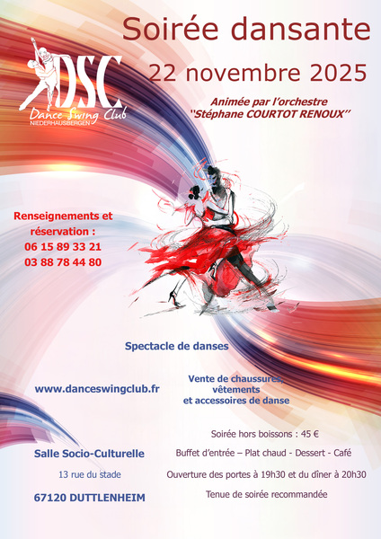Date : Samedi 22/11/2025 Horaires : 19h30 à 03h Tarifs : ffet,n plat principa Organisateur : DANCE SWING CLUB DE NIEDERHAUSBERGEN Adresse de l'événement : 13 RUE DU STADE SALLE SOCIO-CULTURELLE 67120 DUTTLENHEIM Informations complémentaires : Buffet d'entrée, plat principal chaud, dessert, café.