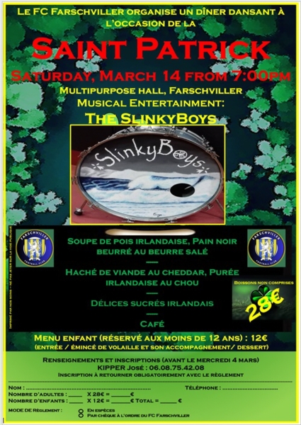 Date : Samedi 14/03/2026 Horaires : 19h Tarifs : 28€ (boissons non comprises), menu enfant 12€ Organisateur : FC FARSCHVILLER Adresse de l'événement : SALLE POLYVALENTE 71 RUE DU STADE 57450 FARSCHVILLER Informations complémentaires : Animation : The SlinkyBoys. Thème : Saint-Patrick. Menu : soupe de pois irlandaise, pain noir au beurre salé, haché de viande au cheddar, purée irlandaise au chou, délices sucrés irlandais et café. Menu enfant (-12 ans) : entrée, émincé de volaille, dessert. Boissons non comprises. Réservation avant le 4 mars 2026. Danses pratiquées : Danse celtique, Danse folklorique Référence de l'annonce : 63970 call06 08 75 42 08
