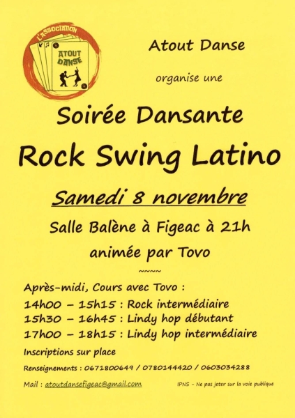 Date : Samedi 08/11/2025 Horaires : 14h à 18h15 Tarifs : Inscriptions sur place Organisateur : ATOUT DANSE Adresse de l'événement : SALLE BALÈNE 46100 FIGEAC Informations complémentaires : Animation : Tovo. Soirée Rock Swing Latino à 21h. Rock intermédiaire de 14h à 15h15. Lindy hop débutant de 15h30 à 16h45. Lindy hop intermédiaire de 17h à 18h15. Stage ouvert à tous les niveaux. Danses pratiquées : Danses latino, Lindy-hop, Rock, Swing Référence de l'annonce : 54692 call06 71 80 06 49call07 80 11 44 20