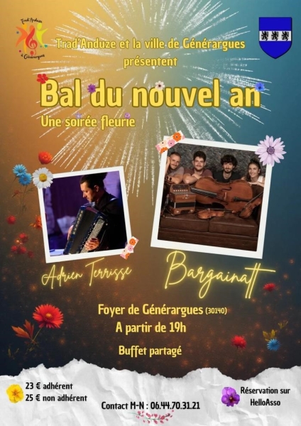 Date : Mercredi 31/12/2025 Horaires : 19h Tarifs : 23€ adhérent, 25€ non adhérent Organisateur : TRAD'ANDUZE ET LA VILLE DE GÉNÉRARGUES Adresse de l'événement : FOYER ROUTE DE MIALET 30140 GENERARGUES Informations complémentaires : Animation : Adrien Terrisse et Bargainatt. Buffet partagé. Réveillon du Nouvel An. Soirée fleurie. Réservation sur HelloAsso. Danses pratiquées : Danse folklorique Référence de l'annonce : 56842 call06 44 70 31 21