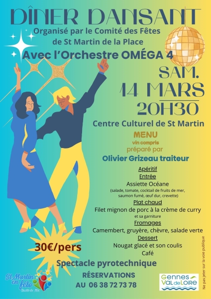 Date : Samedi 14/03/2026 Horaires : 20h à 01h Tarifs : 30€/pers Organisateur : COMITÉ DES FÊTES DE SAINT-MARTIN-DE-LA-PLACE Adresse de l'événement : CENTRE CULTUREL RUE DU CLOS-MARCAIS 49160 GENNES VAL DE LOIRE Danses pratiquées : Danses de salon, Danses en ligne (Line dance), Danses rétro Référence de l'annonce : 64914 call06 38 72 73 78