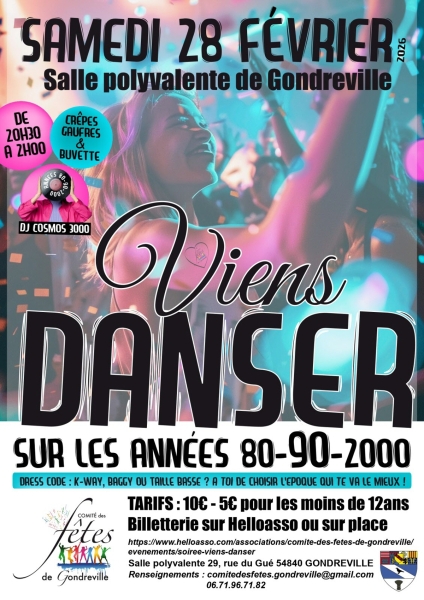 Date : Samedi 28/02/2026 Horaires : 20h30 à 2h Tarifs : 10€ - 5€ pour les moins de 12 ans Organisateur : COMITÉ DES FÊTES DE GONDREVILLE Adresse de l'événement : SALLE POLYVALENTE 29 RUE DU STADE 54840 GONDREVILLE Informations complémentaires : Animation : DJ Cosmos 3000. Thème : années 80, 90 et 2000. Buvette et petite restauration (crêpes et gaufres). Dress code : K-way, baggy ou taille basse. Billetterie sur HelloAsso ou sur place. Accès adapté aux personnes à mobilité réduite. Danses pratiquées : Disco Référence de l'annonce : 63769 call06 71 96 71 82call06 71 76 91 82