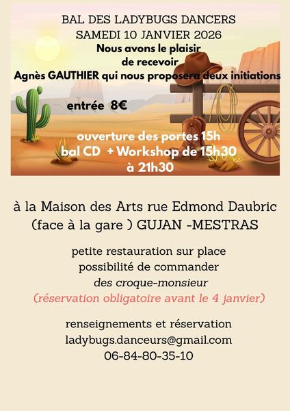 Date : Samedi 10/01/2026 Horaires : 15h30 à 21h30 Tarifs : 8€ (gratuit pour les moins de 18 ans) Organisateur : LADYBUGS DANCERS Adresse de l'événement : MAISON DES ARTS RUE EDMOND DAUBRIC 33470 GUJAN MESTRAS Informations complémentaires : Animation : Agnès Gauthier. Bal CD + workshop. Ouverture des portes à 15h. Petite restauration sur place. Commande de croque-monsieur sur réservation avant le 4 janvier. Salle face à la gare. Danses pratiquées : Country Référence de l'annonce : 56358 call06 84 80 35 10