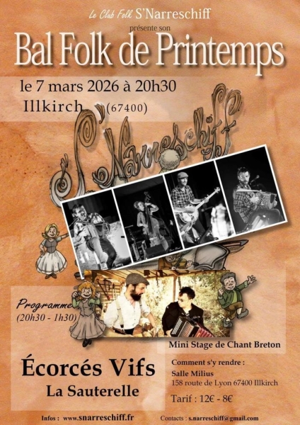 Date : Samedi 07/03/2026 Horaires : 20h30-1h30 Tarifs : 12€/8€ (carte de membre : 10€) Organisateur : CLUB FOLK S'NARRESCHIFF Adresse de l'événement : SALLE DES FÊTES - SALLE MILIUS 158 ROUTE DE LYON 67400 ILLKIRCH GRAFFENSTADEN Informations complémentaires : Animation : Écorcés Vifs et La Sauterelle. Mini stage de chant breton. Salle située à côté de l'arrêt de tramway ligne A "Illkirch Graffenstaden". Danses pratiquées : Danse folklorique Référence de l'annonce : 63855