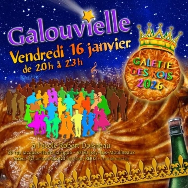 Dates : Vendredi 16/01/2026, Samedi 17/01/2026 Horaires : 20h à 23h Organisateur : GALOUVIELLE Adresse de l'événement : ÉCOLE ROBERT DOISNEAU 26 RUE JACQUES-HENRI-LARTIGUE 92130 ISSY LES MOULINEAUX Informations complémentaires : Galette des Rois offerte avec gâteaux et boissons. Accès : T2 (Lartigue), Bus 123 (Paul Bert), RER C (7 minutes à pied). Danses pratiquées : Danse folklorique Référence de l'annonce : 61167