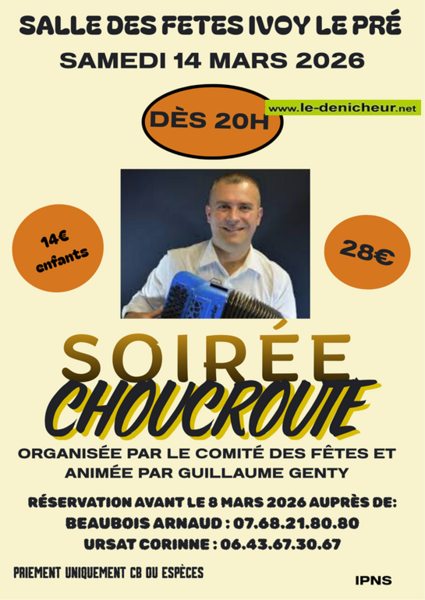 Date : Samedi 14/03/2026 Horaires : 20h Tarifs : 28€ - 14€ enfants Organisateur : COMITÉ DES FÊTES Adresse de l'événement : SALLE DES FÊTES 18380 IVOY LE PRE Informations complémentaires : Animation?: Guillaume Genty. Soirée conviviale mêlant repas et danse. Réservation avant le 8 mars 2026. Paiement uniquement CB ou espèces. Danses pratiquées : Danses de salon, Danses en ligne (Line dance), Danses rétro Référence de l'annonce : 61915 call07 68 21 80 80call06 43 67 30 67