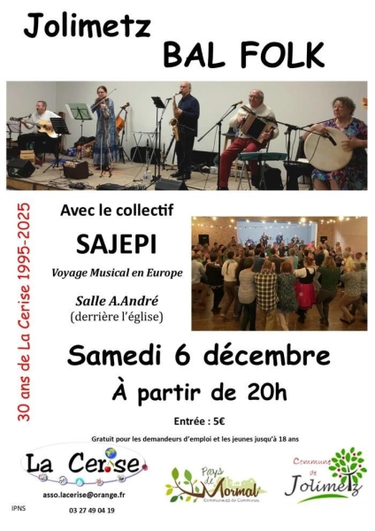 Date : 06/12/2025 (Événement passé) Horaires : 20h Tarifs : 5€ ; gratuit pour les demandeurs d'emploi et les jeunes de moins de 18 ans Organisateur : LA CERISE Adresse de l'événement : SALLE ARTHUR ANDRÉ 5 RUE COULON 59530 JOLIMETZ Informations complémentaires : Animation : Collectif Sajepi. Voyage musical en Europe. 30 ans de l'association La Cerise. Salle située derrière l'église. Petite restauration et buvette prévues. Danses pratiquées : Danse folklorique Référence de l'annonce : 55578 call03 27 49 04 19