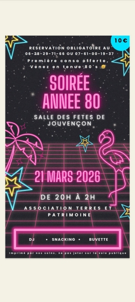 Date : Samedi 21/03/2026 Horaires : 20h à 2h Tarifs : 10€ Organisateur : TERRES ET PATRIMOINE Adresse de l'événement : SALLE DES FÊTES 586 ROUTE DU BOURG 71290 JOUVENCON Informations complémentaires : Première consommation offerte. Réservation obligatoire. Animation : DJ. Snacking et buvette disponibles. Parking à proximité. Thème : Années 80. Tenue années 80 conseillée. Danses pratiquées : Disco Référence de l'annonce : 64612 call06 28 29 71 66call07 61 00 19 37