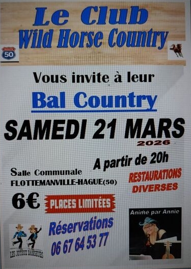 Date : Samedi 21/03/2026 Horaires : 20h Tarifs : Entrée : 6€ Organisateur : LE CLUB WILD HORSE COUNTRY - LES JOYEUX DANSEURS Adresse de l'événement : SALLE COMMUNALE 50440 LA HAGUE Informations complémentaires : Animation : Annie. Resturations diverses. Places limitées. Danses pratiquées : Country Référence de l'annonce : 51180 call06 67 64 53 77