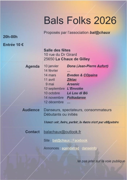 Dates : Samedi 10/01/2026, Dimanche 11/01/2026 Horaires : 20h à minuit Tarifs : Entrée 10€ Organisateur : ASSOCIATION BAL@CHAUX Adresse de l'événement : SALLE DES FÊTES 10 RUE DU DOCTEUR GIRARD 25650 LA CHAUX Informations complémentaires : Atelier animé par Pascal Viennet : Mazurka van Hofstade, Bourrée des Grandes Poteries. Animation : Duo Dona (Sylvie Heusse, Jean-Pierre Aufort) et groupe Eveden & Copains. Salle des fêtes. Public débutant ou initié. Boissons disponibles. Série de bals mensuels : 10/01/2026 : Animation "Dona (Jean-Pierre Aufort)" 14/02/2026 : Animation non précisée 14/03/2026 : Animation "Eveeden & Copains" 11/04/2026 : Animation "Ziklac" 09/05/2026 : Animation "Arsenic" 12/09/2026 : Animation "L'Envolée" 10/10/2026 : Animation "Lé Lou di Bô" 14/11/2026 : Animation "Folkadanse" 12/12/2026 : Animation non précisée. Danses pratiquées : Danse folklorique Référence de l'annonce : 61114