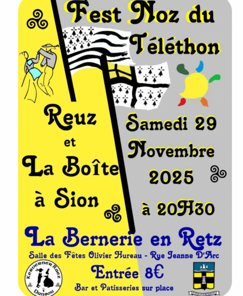 Date : Samedi 29/11/2025 Horaires : 20h30 Tarifs : 8€ Organisateur : MARYSE MAGNAC Adresse de l'événement : SALLE DES FÊTES OLIVIER HUREAU RUE JEANNE D'ARC 44760 LA BERNERIE EN RETZ Informations complémentaires : Animation : Reuz et La Boîte à Sion. Soirée au profit du Téléthon. Bar et pâtisseries sur place. Danses pratiquées : Danse folklorique Référence de l'annonce : 54630 call06 34 54 16 21