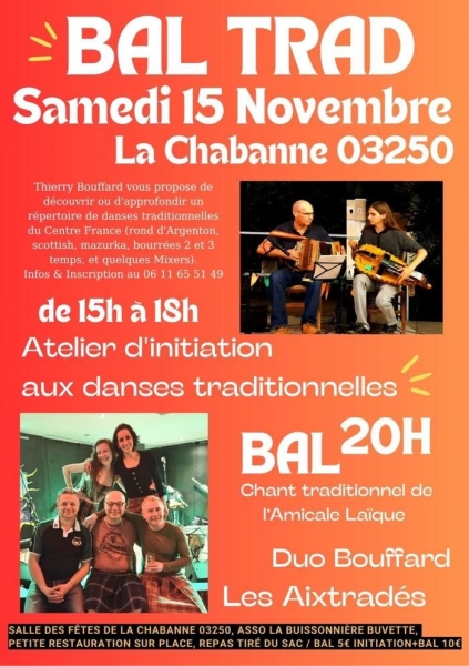 Date : Samedi 15/11/2025 Horaires : 15h à 18h Tarifs : Initiation + bal 10€; bal seul 5€ Organisateur : ASSO LA BUISSONNIÈRE Adresse de l'événement : SALLE DES FÊTES 03250 LA CHABANNE Informations complémentaires : Animation : Duo Bouffard et Les Aixtradés. Pause avec chants traditionnels de l?Amicale Laïque. Restauration sur place, repas tiré du sac, buvette.