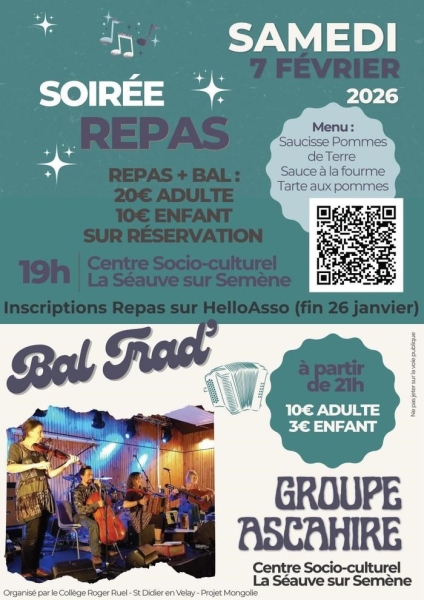 Date : 07/02/2026 (Événement passé) Horaires : 19h Tarifs : Repas + bal : 20€ adulte, 10€ enfant. Bal seul : 10€ adulte, 3€ enfant. Organisateur : COLLÈGE ROGER RUEL - SAINT-DIDIER-EN-VELAY - PROJE Adresse de l'événement : CENTRE SOCIO-CULTUREL ZA LA GARE 43140 LA SEAUVE SUR SEMENE Informations complémentaires : Animation : Groupe Ascahire. Danses : valses, mazurka, scottish, cercle, bourrées. Menu : saucisse, pommes de terre, sauce à la fourme, tarte aux pommes. Réservation obligatoire avant le 26 janvier. Ouverture des portes à 19h pour le repas, bal à partir de 21h. Salle socio-culturelle. Danses pratiquées : Danse folklorique Référence de l'annonce : 62393