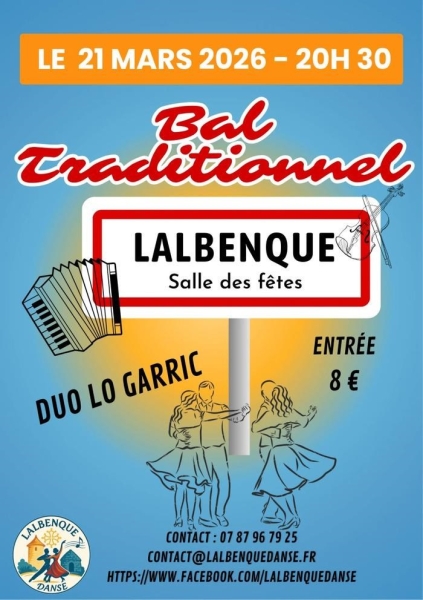 Date : Samedi 21/03/2026 Horaires : 20h30 Tarifs : Entrée 8€ Organisateur : LALBENQUE DANSE Adresse de l'événement : SALLE DES FÊTES 46230 LALBENQUE Informations complémentaires : Animation : Duo Lo Garric. Danses pratiquées : Danse folklorique Référence de l'annonce : 64566 call07 87 96 79 25