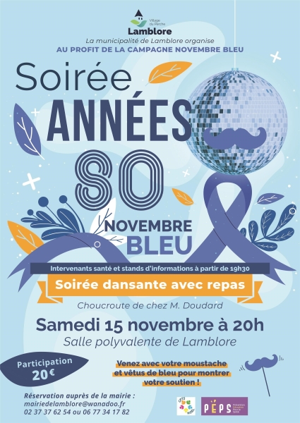 Date : Samedi 15/11/2025 Horaires : 19h30 Tarifs : 20€ Organisateur : MUNICIPALITÉ DE LAMBLORE Adresse de l'événement : SALLE POLYVALENTE 28340 LAMBLORE Informations complémentaires : Choucroute de chez M. Doudard. Au profit de la campagne Novembre bleu. Intervenants santé et stands d'informations à partir de 19h30. Soirée dansante avec repas. Tenue bleue et moustache recommandées. Danses pratiquées : Danses en ligne, Disco en ligne Référence de l'annonce : 54339 call02 37 37 62 54call06 77 34 17 82