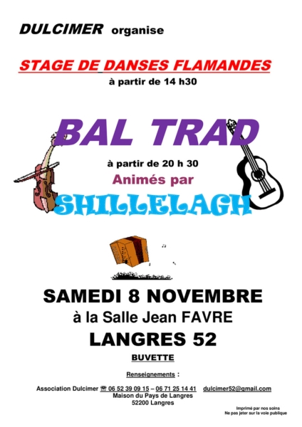 Date : Samedi 08/11/2025 Horaires : 14h30 à 18h30 puis 20h30 Tarifs : Stage sur inscription, bal entrée libre Organisateur : ASSOCIATION DULCIMER Adresse de l'événement : SALLE JEAN-FAVRE RUE JEAN-FAVRE 52200 LANGRES Informations complémentaires : Animation : Shillelagh. Bal à 20h30 jusqu'à 2h. Danses de Flandre française et danses folk (bourrée, scottish, cercles...). Buvette. Salle Jean-Favre à Langres. Danses pratiquées : Danse folklorique Référence de l'annonce : 54168 call06 52 39 09 15call06 71 25 14 41