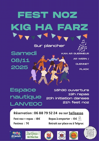 Date : Samedi 08/11/2025 Horaires : 18h30-23h59 Tarifs : Fest-noz + repas 18€ ; Repas à emporter 15€ ; Fest-noz 7€ Organisateur : ÉCOLE DIWAN DE CROZON ET SON COMITÉ DE SOUTIEN Adresse de l'événement : ESPACE NAUTIQUE LE L RUE DE LA GRÈVE 29160 LANVEOC Informations complémentaires : Animation : Kan ar Guermeur, Ar Wern/Quenet, Plack. Ouverture à 18h30. Repas à 19h. Initiation danses à 20h. Fest-noz à 21h. Réservation obligatoire pour les repas sur place ou à emporter. Retrait des parts à Lanvéoc de 17h30 à 18h30 et à Telgruc (Le Magellan) de 18h à 19h. Inscription avant le 2 novembre. Sur plancher. Danses pratiquées : Danse bretonne Référence de l'annonce : 54182 call06 88 79 52 24
