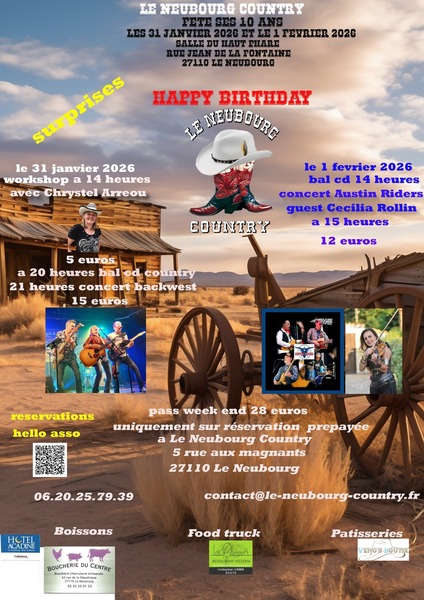 Dates : Samedi 31/01/2026, Dimanche 01/02/2026 Horaires : 14h#20h#21h Tarifs : Workshop 5€, Concert Backwest 15€, Concert Austin Riders 12€, Pass week-end 28€. Organisateur : LE NEUBOURG COUNTRY Adresse de l'événement : SALLE DU HAUT PHARE RUE JEAN DE LA FONTAINE 27110 LE NEUBOURG Informations complémentaires : Animation : Chrystel Arréou, Backwest, Austin Riders, Guest Cecilia Rollin. Réservations uniquement en prévente via HelloAsso. Sur place : boissons, food truck, pâtisseries. Danses pratiquées : Country Référence de l'annonce : 50183 call06 20 25 79 39