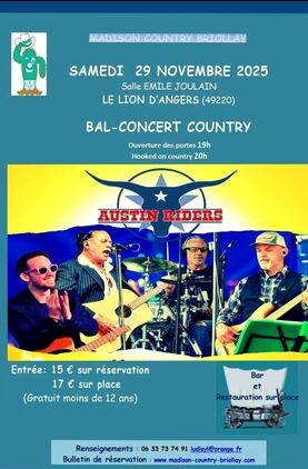 Date : Samedi 29/11/2025 Horaires : Ouverture des portes 19h, Concert à 20h Tarifs : 15€ sur réservation / 17€ sur place - Gratuit pour les moins de 12 ans Organisateur : MADISON COUNTRY BRIOLLAY Adresse de l'événement : SALLE ÉMILE JOULAIN 49220 LE LION D ANGERS Informations complémentaires : Animation : Hooked on Country et Austin Riders. Bar et restauration sur place. Danses pratiquées : Country, Madison Référence de l'annonce : 53982 call06 33 73 74 91