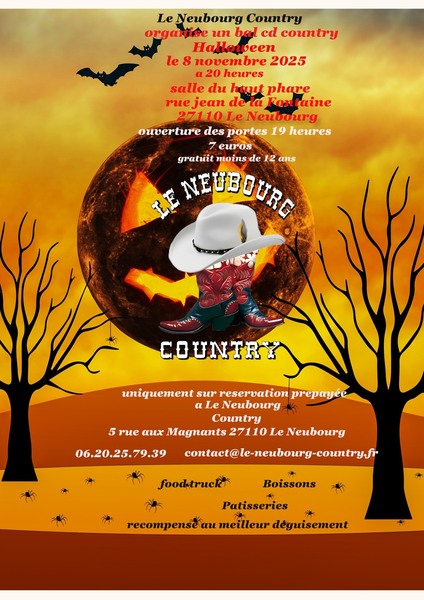 Date : Samedi 08/11/2025 Horaires : Ouverture des portes à 19h, bal à partir de 20h Tarifs : 7€ (gratuit pour les moins de 12 ans) Organisateur : LE NEUBOURG COUNTRY Adresse de l'événement : SALLE DU HAUT PHARE RUE JEAN DE LA FONTAINE 27110 LE NEUBOURG Informations complémentaires : Sur place : food truck, boissons, pâtisseries. Animation spéciale : récompense au meilleur déguisement. Réservation obligatoire (prépayée). Danses pratiquées : Country Référence de l'annonce : 50181 call06 20 25 79 39