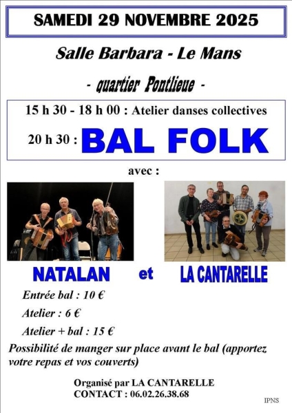 Date : Samedi 29/11/2025 Horaires : 15h30-18h#20h30 Tarifs : Entrée bal : 10€ Atelier : 6€ Atelier + bal : 15€ Organisateur : LA CANTARELLE Adresse de l'événement : SALLE BARBARA 10 PLACE DE L'ÉGLISE 72000 LE MANS Informations complémentaires : Animation : NATALAN et LA CANTARELLE. Possibilité de manger sur place avant le bal (apportez votre repas et vos couverts). Quartier Pontlieue.