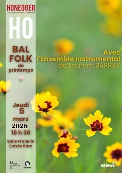 Date : Jeudi 05/03/2026 Horaires : 18h30 à 22h30 Tarifs : Entrée libre Organisateur : CONSERVATOIRE ARTHUR HONEGGER DU HAVRE Adresse de l'événement : SALLE FRANKLIN 117 COURS DE LA RÉPUBLIQUE 76600 LE HAVRE Informations complémentaires : Animation : Ensemble Instrumental de Laurent Barray. Bal Folk animé par l'Ensemble des Musiques Traditionnelles du Conservatoire Arthur Honegger. Événement organisé avec le Service de la Culture et le Département de la Seine-Maritime. Danses pratiquées : Danse folklorique Référence de l'annonce : 63816