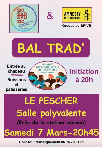 Dates : Samedi 07/03/2026, Dimanche 08/03/2026 Horaires : 20h à minuit Tarifs : Entrée au chapeau Organisateur : AMNESTY INTERNATIONAL - GROUPE DE BRIVE Adresse de l'événement : SALLE POLYVALENTE PRÈS DE LA STATION-SERVICE 19190 LE PESCHER Informations complémentaires : Animation : groupe Zic-Zad. Initiation de 20h à 20h45. Danses traditionnelles : cercles, chapeloises, rondeaux, rondes, scottish, etc. Boissons et pâtisseries sur place. Journée internationale des droits des femmes. Danses pratiquées : Danse folklorique Référence de l'annonce : 58916 call06 74 70 01 89