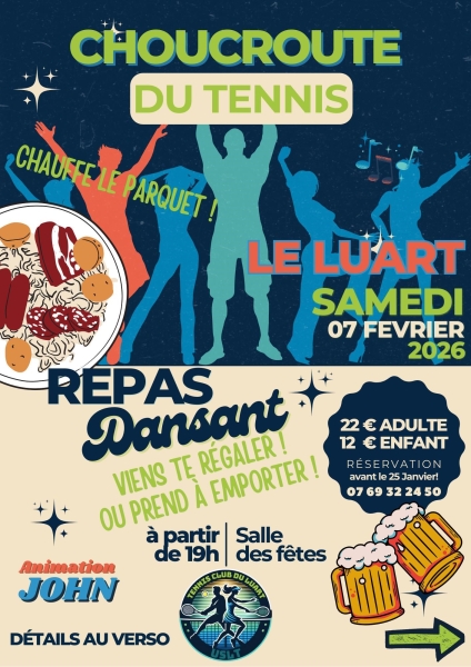 Date : Samedi 07/02/2026 Horaires : 19h à 02h Tarifs : Adulte 22€ ? Moins de 12 ans ou à emporter 12€ Organisateur : USL TENNIS Adresse de l'événement : SALLE DES FÊTES RUE ROLAND-DU-LUART 72390 LE LUART Danses pratiquées : Danses de salon, Danses en ligne, Danses rétro Référence de l'annonce : 61348 call07 69 32 24 50