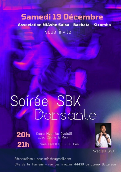 Date : Samedi 13/12/2025 Horaires : 20h à 01h Tarifs : Cours 10€, Soirée gratuite Organisateur : ASSOCIATION MIASHE Adresse de l'événement : COMPLEXE LA TANNERIE RUE DES MOULINS 44430 LE LOROUX BOTTEREAU Informations complémentaires : Animation : DJ Bao. Cours de kizomba évolutif avec Céline et Mervil à 20h. Danses : salsa, bachata, kizomba. Ambiance conviviale et dynamique. Parking à proximité. Danses pratiquées : Bachata, Danses latino, Kizomba, Salsa Référence de l'annonce : 56739 call07 61 14 03 03