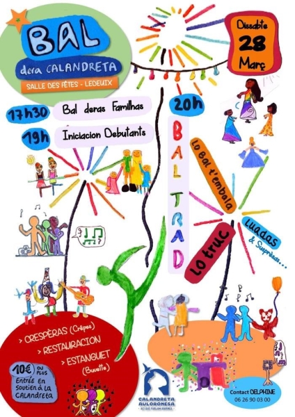 Dates : Samedi 28/03/2026, Dimanche 29/03/2026 Horaires : 17h30 Tarifs : 10€ (entrée en soutien à la Calandreta) Organisateur : CALANDRETA AULORONESA Adresse de l'événement : SALLE DES FÊTES RUE DE LAMARQUE 64400 LEDEUIX Danses pratiquées : Danse folklorique Référence de l'annonce : 64978 call06 26 90 03 00
