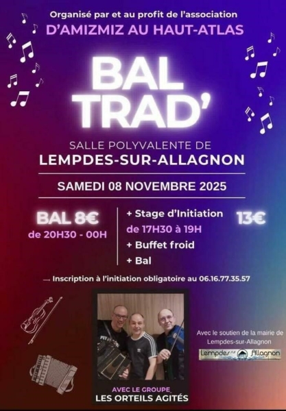 Date : 08/11/2025 (Événement passé) Horaires : 17h30 à 19h (stage) ; 20h30 à 00h (bal) Tarifs : Stage et bal 13€ ; Bal seul 8€ Organisateur : ASSOCIATION D?AMIZMIZ AU HAUT-ATLAS Adresse de l'événement : SALLE DES FÊTES RUE PRINCIPALE 43410 LEMPDES SUR ALLAGNON Informations complémentaires : Inscription à l'initiation danse obligatoire