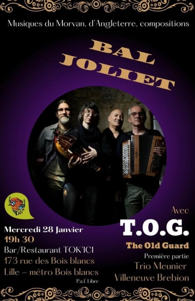 Date : Mercredi 28/01/2026 Horaires : 19h30 à 23h30 Tarifs : Participation libre Organisateur : LE TOK'ICI Adresse de l'événement : LE TOK'ICI 173 RUE DES BOIS-BLANCS 59000 LILLE Informations complémentaires : Animation : T.O.G. (The Old Guard). Première partie : Trio Meunier Villeneuve Brebion. Musiques du Morvan, d'Angleterre et compositions. Restauration et accueil sur place. Accès métro Bois-Blancs. Danses pratiquées : Danses de salon, Danses en ligne, Danses rétro Référence de l'annonce : 61246