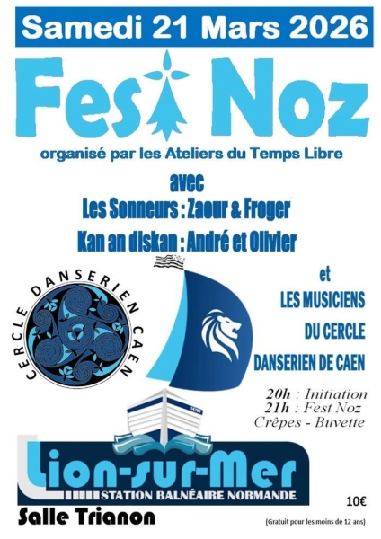 Date : Samedi 21/03/2026 Horaires : 20h à 21h (initiation) puis 21h (Fest-Noz) Tarifs : 10€ (gratuit pour les moins de 12 ans) Organisateur : LES ATELIERS DU TEMPS LIBRE Adresse de l'événement : SALLE TRIANON 14780 LION SUR MER Informations complémentaires : Animation : Les Sonneurs Zaour & Froger, Kan an disk an André et Olivier, musiciens du Cercle Danserien de Caen. Crêpes et buvette. Danses pratiquées : Danse bretonne Référence de l'annonce : 64570