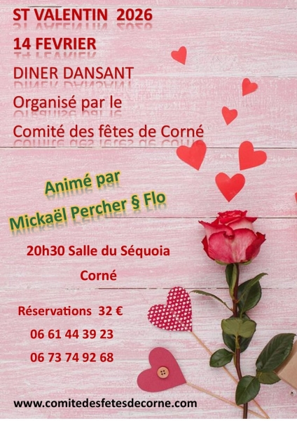 Date : Samedi 14/02/2026 Horaires : 20h30 à 00h Tarifs : 32€ Organisateur : COMITÉ DES FÊTES DE CORNÉ Adresse de l'événement : SALLE DU SÉQUOIA ROUTE DE SAINT-MATHURIN 49140 LOIRE AUTHION Informations complémentaires : Animation : Mickaël Percher & Flo. Thème : Saint-Valentin. Sur réservation. Danses pratiquées : Danses de salon, Danses en ligne, Danses rétro Référence de l'annonce : 61441 call06 61 44 39 23call06 73 74 92 68