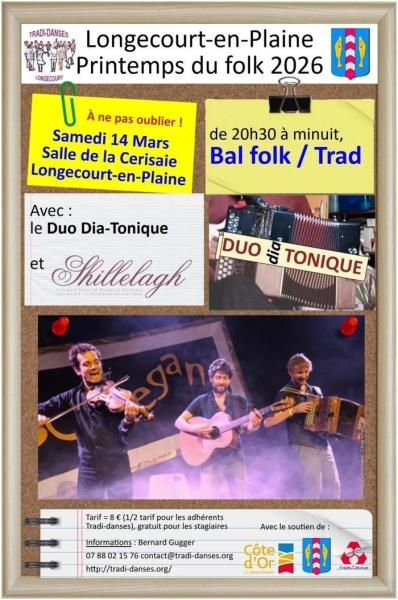 Date : Samedi 14/03/2026 Horaires : 20h30 à minuit Tarifs : 8€ (demi-tarif pour les adhérents Tradi-danses, gratuit pour les stagiaires) Organisateur : TRADI-DANSES Adresse de l'événement : SALLE DE LA CERISAIE ROUTE DE DIJON 21110 LONGECOURT EN PLAINE Informations complémentaires : Animation : Duo Dia-Tonique et Shillelagh. Fait partie du Printemps du Folk 2026. Soutien du département de la Côte-d'Or. Danses pratiquées : Danse folklorique Référence de l'annonce : 58959 call07 88 02 15 76