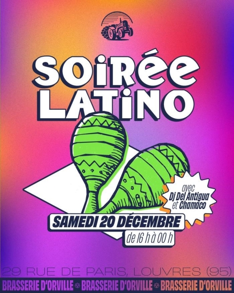 Date : Samedi 20/12/2025 Horaires : 16h à 00h Tarifs : Entrée gratuite Organisateur : BRASSERIE D'ORVILLE Adresse de l'événement : BRASSERIE D'ORVILLE 29 RUE DE PARIS 95380 LOUVRES Informations complémentaires : Animation : DJ Del Antigua et Chamaco. Cours de danse avec Chamaco. Mix à 19h. Danses : salsa, bachata, reggaeton, merengue, latin house, coupé décalé, zouk, samba, vallenato, cumbia, ragga. Danses pratiquées : Bachata, Cumbia, Danses latino, Merengue, Salsa, Samba, Zouk Référence de l'annonce : 56782 call01 85 52 11 11