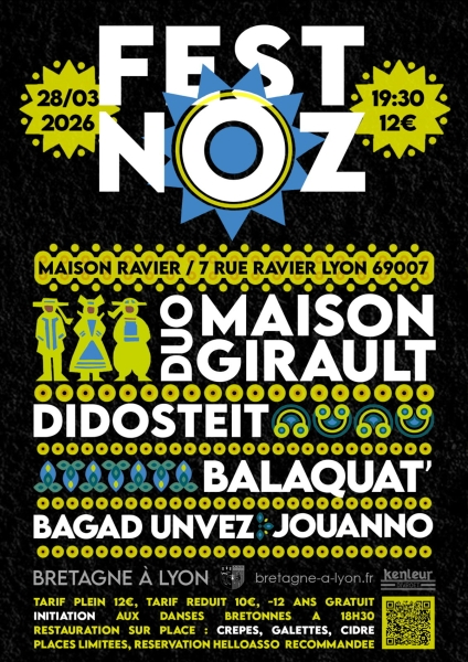 Date : Samedi 28/03/2026 Horaires : 18h30 à 23h50 Tarifs : 12€ (tarif réduit 10€, -12 ans gratuit) Organisateur : ASSOCIATION BRETAGNE À LYON Adresse de l'événement : SALLE RAVIER 7 RUE RAVIER 69007 LYON 07 Informations complémentaires : Animation : Unvez, BALàquat', Didosteit, Maison Girault, Bagad Unvez Jouanno. Initiation aux danses bretonnes à 18h30. Restauration sur place : crêpes, galettes, cidre. Accès adapté aux personnes à mobilité réduite. Places limitées, réservation recommandée. Danses pratiquées : Danse bretonne Référence de l'annonce : 64132 call07 80 49 73 99