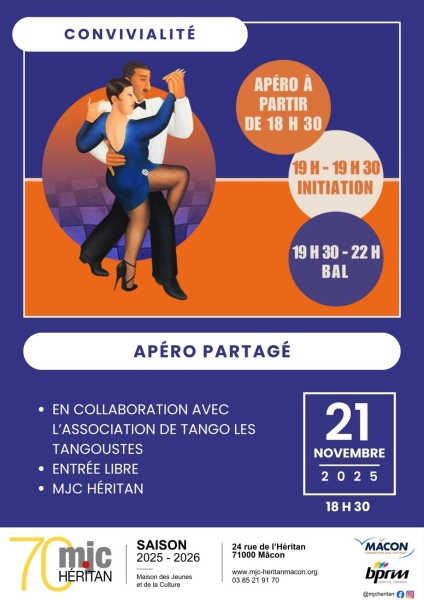 Date : Vendredi 21/11/2025 Horaires : 18h30 à 22h Tarifs : Gratuit Organisateur : MJC HÉRITAN Adresse de l'événement : MJC HÉRITAN 24 RUE DE L'HÉRITAN 71000 MACON Informations complémentaires : Le principe est d'apporter quelque chose à grignoter et/ou à boire et le partager. En collaboration avec l'association de tango : Les Tangoustes, venez papoter, manger et danser avec nous.