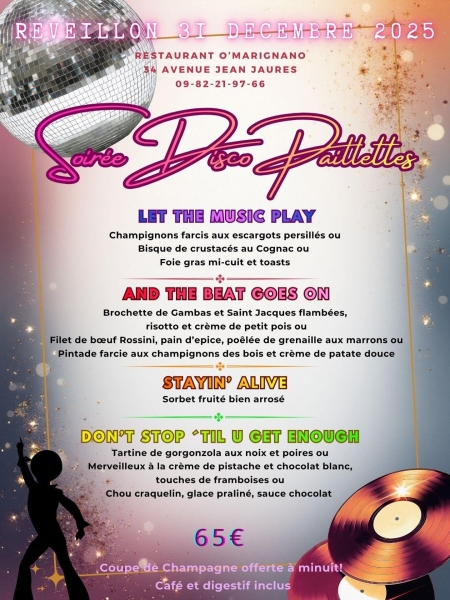 Date : Mercredi 31/12/2025 Tarifs : 65€ Organisateur : RESTAURANT O'MARIGNANO Adresse de l'événement : RESTAURANT O'MARIGNANO 14 AVENUE JEAN-JAURÈS 13700 MARIGNANE Informations complémentaires : Animation : Thème Disco Paillettes. Coupe de Champagne offerte à minuit. Café et digestif inclus. Menu au choix : champignons farcis aux escargots persillés, bisque de crustacés au Cognac ou foie gras mi-cuit et toasts. Plat : brochette de gambas et Saint-Jacques flambées, risotto et crème de petit pois ou filet de boeuf Rossini, pain d'épice, poêlée de grenaille aux marrons ou pintade farcie aux champignons des bois et crème de patate douce. Dessert : tartine de gorgonzola aux noix et poires, merveille à la crème de pistache et chocolat blanc, touches de framboises ou chou craquelin, glace praliné, sauce chocolat. Danses pratiquées : Disco en ligne Référence de l'annonce : 56816 call09 82 21 97 66