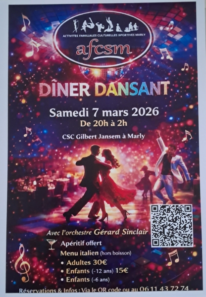 Date : Samedi 07/03/2026 Horaires : 20h à 2h Tarifs : Adultes 30€ Enfants (-12 ans) 15€ Enfants (-6 ans) gratuit Organisateur : AFCSM Adresse de l'événement : SALLE DES FÊTES CSC GILBERT JANSEM 54 RUE DE LA CROIX-SAINT-JOSEPH 57155 MARLY Informations complémentaires : Animation : Orchestre Gérard Sinclair. Apéritif offert. Menu italien (hors boisson). Boisson en sus. Danses pratiquées : Danses de salon, Danses en ligne (Line dance), Danses rétro Référence de l'annonce : 63879 call06 11 43 72 74