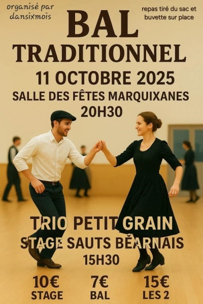 Date : Samedi 11/10/2025 Horaires : 15h30 Tarifs : 10€ stage, 7€ bal, 15€ les deux Organisateur : DANSIXMOIS Adresse de l'événement : SALLE DES FÊTES 1 AVENUE ROGER ROQUEFORT 66320 MARQUIXANES Informations complémentaires : Animation : Trio Petit Grain. Bal trad à 20h30. Repas tiré du sac et buvette sur place. Danses pratiquées : Danse folklorique Référence de l'annonce : 52119