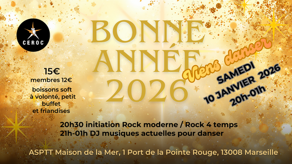 Date : Samedi 10/01/2026 Horaires : 20h-01h Tarifs : 15€ Organisateur : CEROC FRANCE Adresse de l'événement : ASPTT MAISON DE LA MER ENTRÉE 1 PORT DE LA POINTE ROUGE 13008 MARSEILLE 08 Informations complémentaires : Le 10 janvier, rejoignez-nous pour une soirée spéciale Nouvel An placée sous le signe de la simplicité, du partage et de la bonne humeur. Que vous veniez seul(e) ou accompagné(e), vous serez accueilli(e) avec attention et bienveillance par toute l'équipe ainsi que par les danseurs habitués. Ici, chacun trouve facilement sa place.